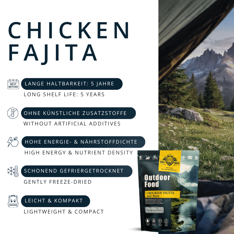 Unser Chicken Fajita mit Reis ist ein echter Klassiker für draußen: köstlich pur oder eingerollt in einem Wrap. Zarte Hähnchenstücke treffen auf eine pikante Fajita-Sauce, verfeinert mit Paprika, Knoblauch, Kreuzkümmel und Paprikapulver. Zusammen mit Reis entsteht ein herzhaftes, wärmendes Gericht, das nach einem langen Tag in der Natur genau das Richtige ist.