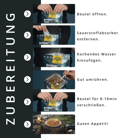 Ideal für alle, die draußen auf eine zuverlässige, sättigende und geschmackvolle Mahlzeit setzen – ob beim Wandern, Trekking, Camping oder auf Expeditionen.