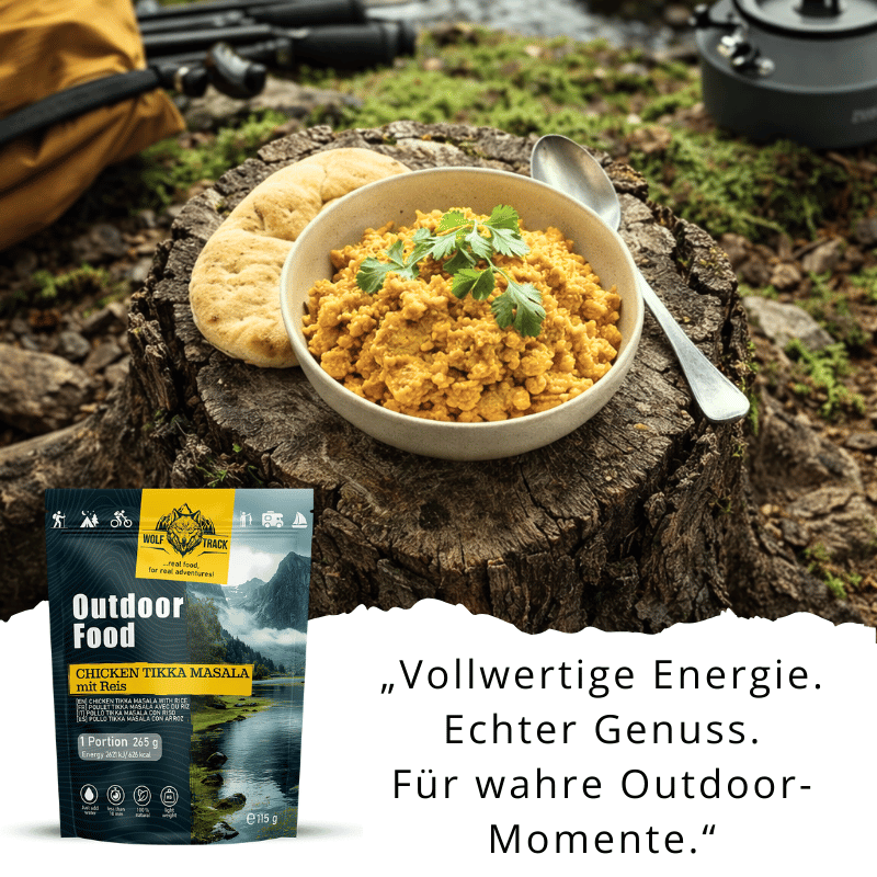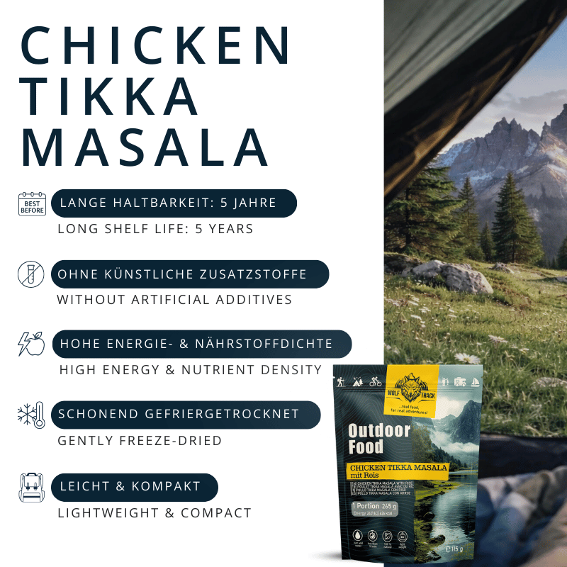 Zarte Hähnchenbruststücke, nach traditionellem Tikka-Rezept in einer aromatischen Sauce gegart und serviert mit lockerem weißen Reis – ideal für ein genussvolles Lagerfeueressen und zum Auftanken für das nächste Abenteuer.