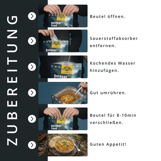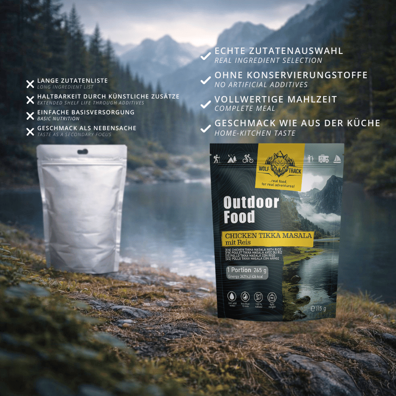 Ideal für alle, die draußen auf eine zuverlässige, sättigende und geschmackvolle Mahlzeit setzen – ob beim Wandern, Trekking, Camping oder auf Expeditionen.
